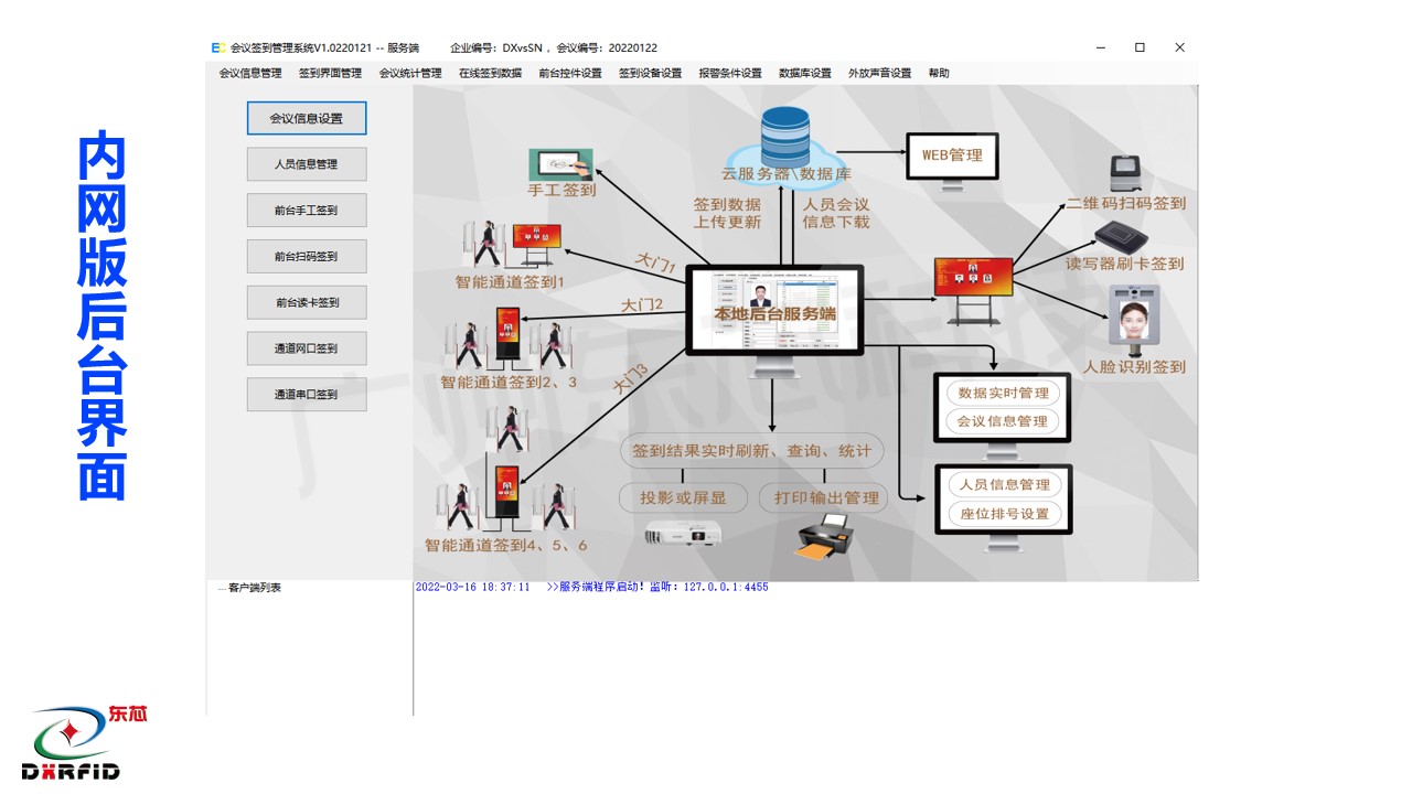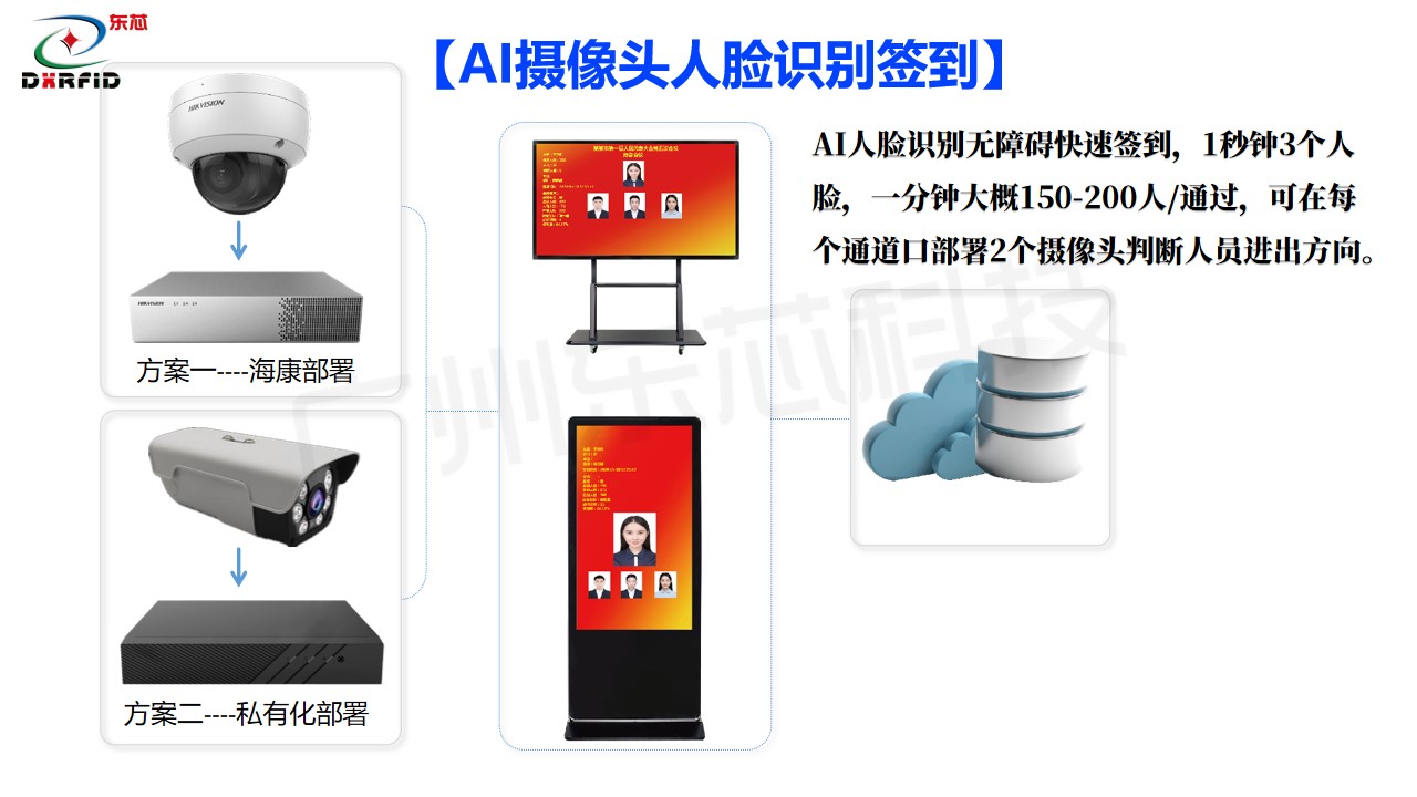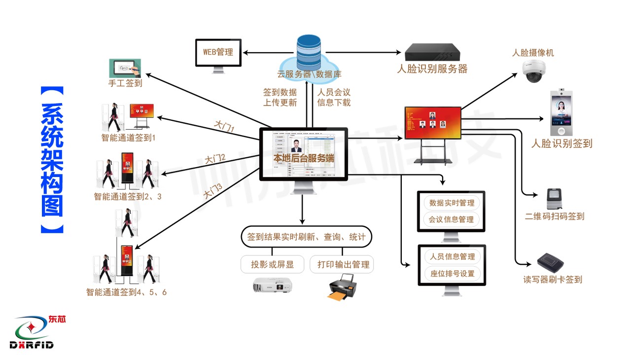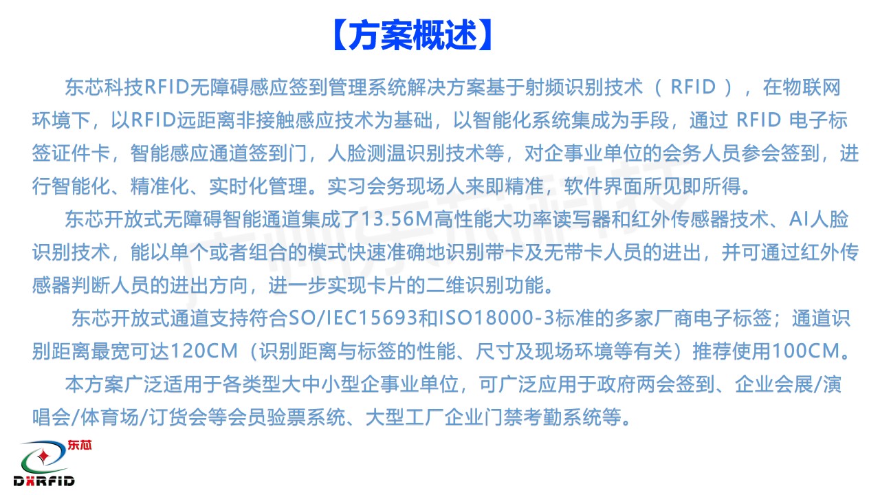 化系统集成为手段,通过 RFID tianqi.com证件卡,智能感应通道签到门,人脸测温识别技术等,对企事业单位的会务人员参会签到,进行智能化、