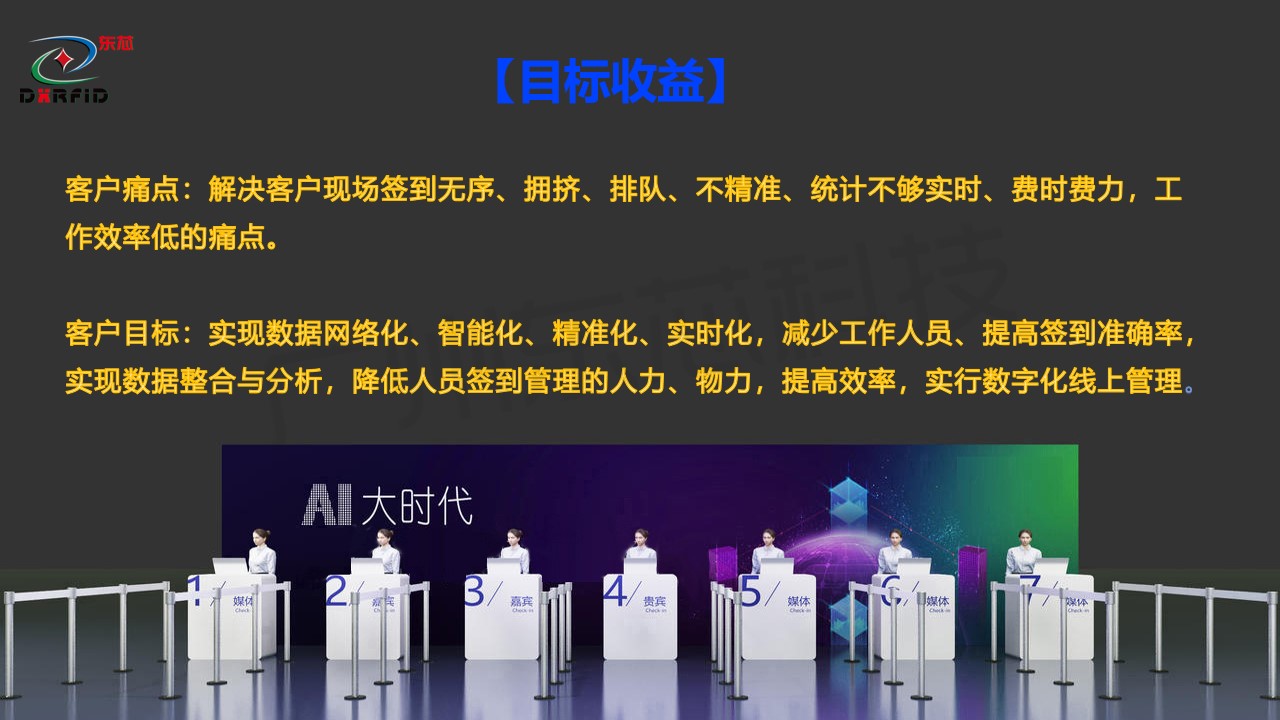 客户目标:实现数据网络化、智能化、精准化、实时化,减少工作人员、提高签到准确率,实现数据整合与分析,降低人员签到管理的人力、物力,
